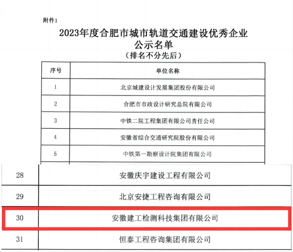 安徽建工檢測科技集團有限公司榮獲2023年度合肥市城市軌道交通建設(shè)“優(yōu)秀企業(yè)”稱號