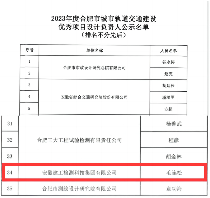 近日,合肥市城市軌道交通協(xié)會下發(fā)《關(guān)于表彰2023年度合肥市城市軌道交通建設(shè)的優(yōu)秀企業(yè)和優(yōu)秀項目經(jīng)理名單的通知》文件,安徽建工檢測科技集團有限公司被授予“優(yōu)秀企業(yè)”稱號,毛連松同志榮獲“優(yōu)秀項目經(jīng)理”榮譽稱號。這是建工檢測第三次獲此“優(yōu)秀企業(yè)”榮譽稱號。