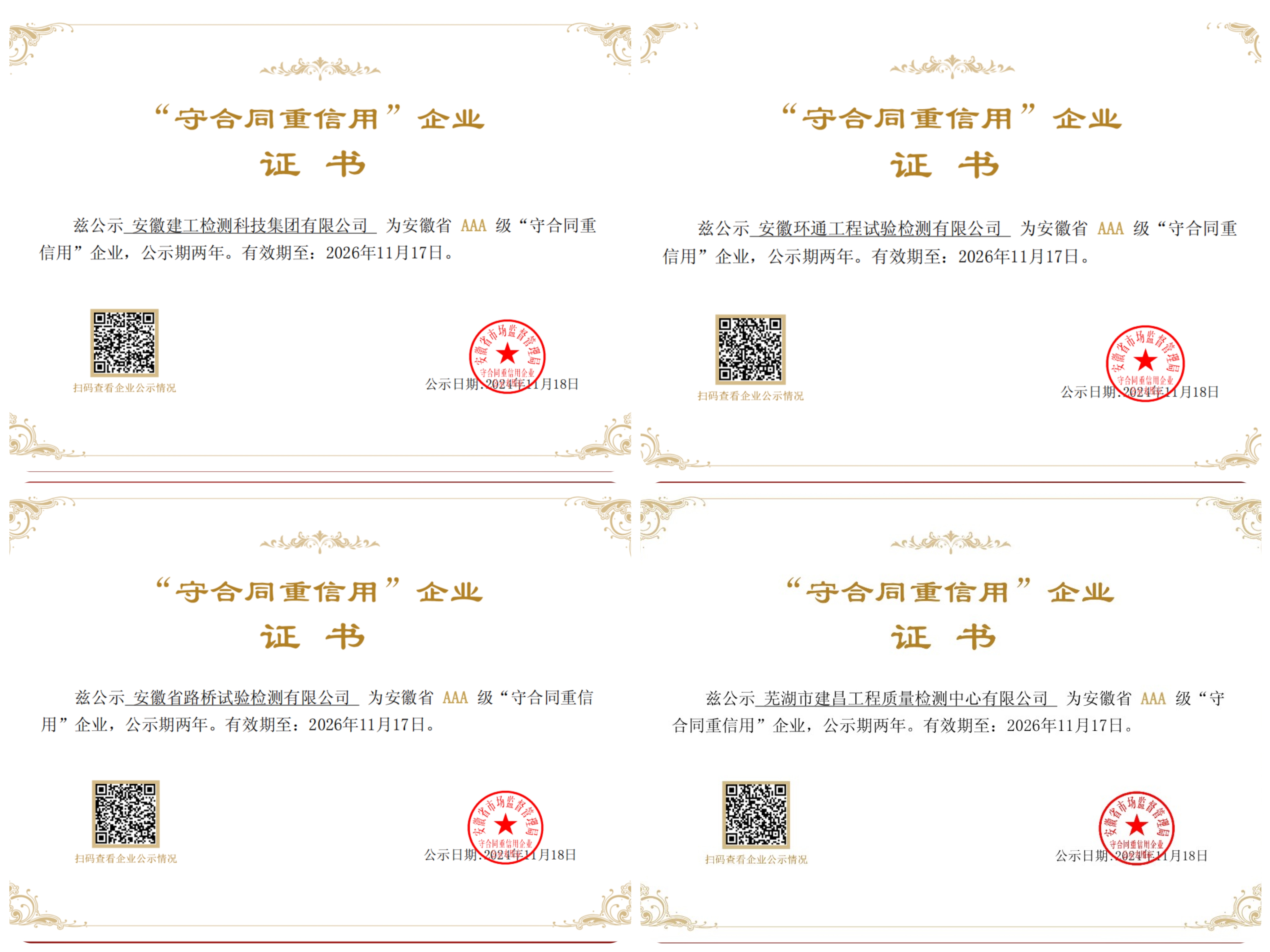 近日,在安徽省市場監(jiān)督管理局開展的2022-2023年度“安徽省守合同重信用”AAA級企業(yè)評級中,我司及所屬子公司安徽省路橋試驗檢測有限公司、安徽環(huán)通工程試驗檢測有限公司、蕪湖市建昌工程質(zhì)量檢測中心有限公司同時獲評2022-2023年度“安徽省守合同重信用”AAA級企業(yè)。