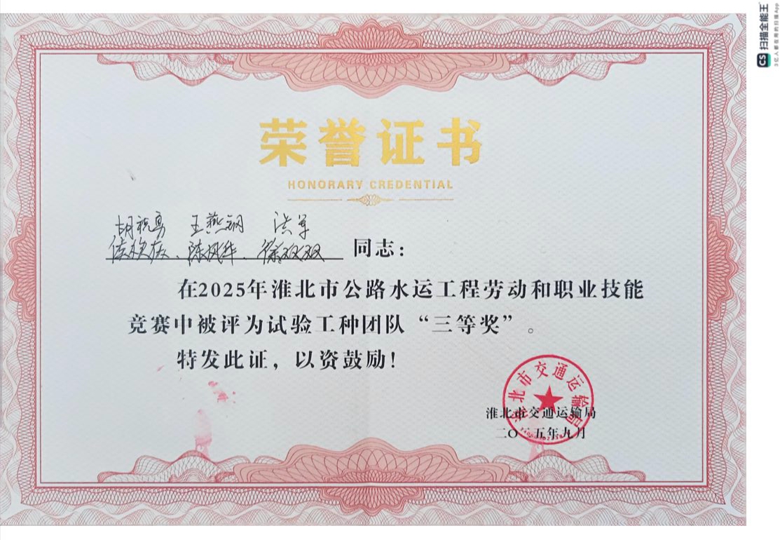 此次獲獎,既是對公司技能人才培養(yǎng)成果的肯定,更激勵著全體員工以賽促學、以學促干,為淮北市公路水運工程高質(zhì)量發(fā)展貢獻更多力量。