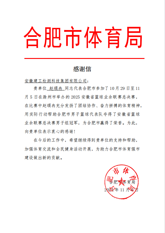 近日,合肥市體育局向安徽建工檢測科技集團(tuán)發(fā)來感謝信,對公司職工趙頌冉在2025年安徽省籃球業(yè)余聯(lián)賽中的優(yōu)異表現(xiàn)予以通報表揚(yáng)。
