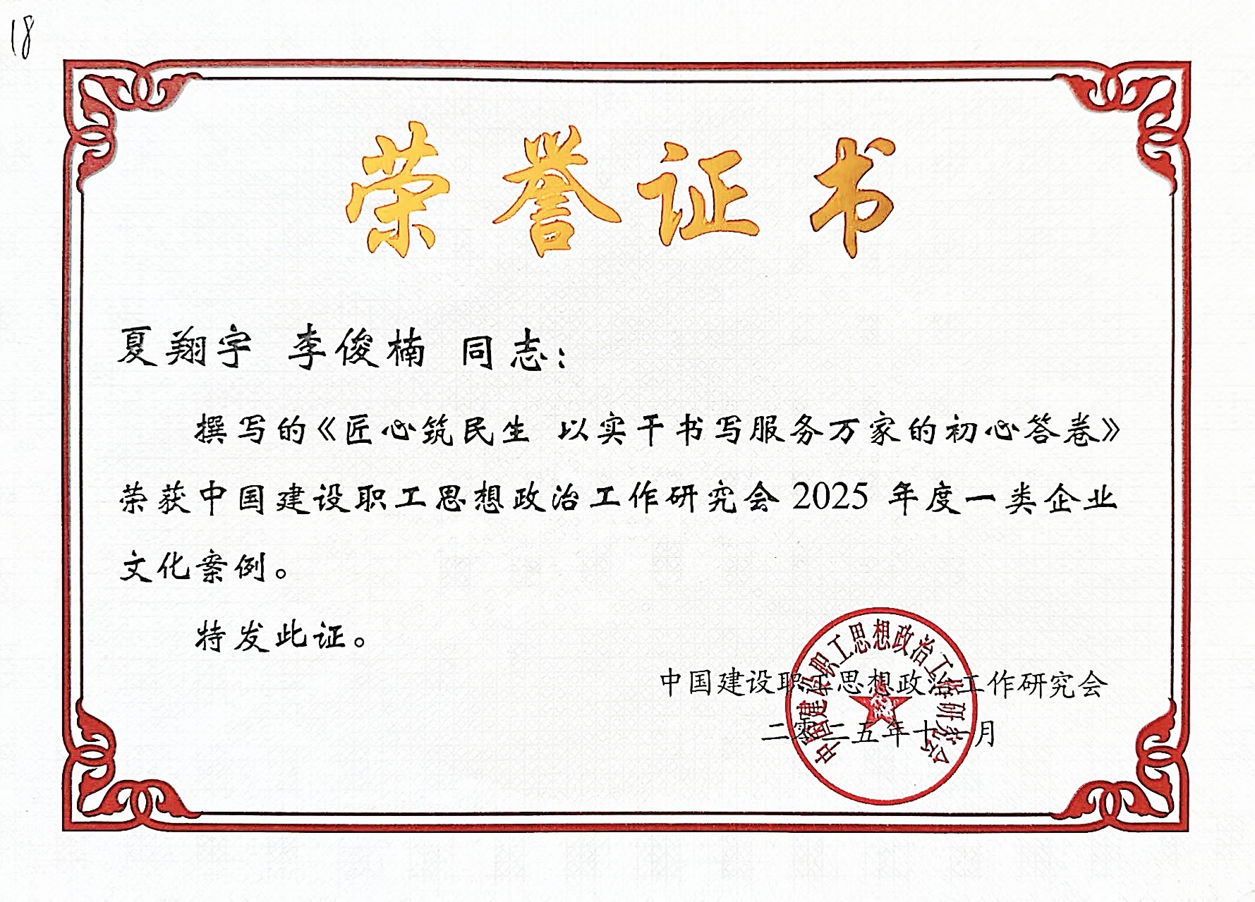 公司企業(yè)文化案例獲評2025年度中國建設(shè)職工思想政治工作一類企業(yè)文化案例