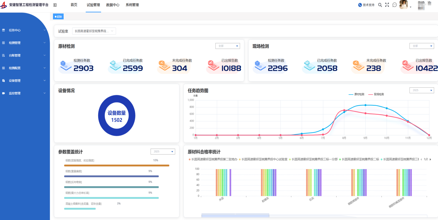 智慧平臺(tái)充分立足項(xiàng)目實(shí)際,兼具技術(shù)、效率、服務(wù)多重優(yōu)勢(shì),實(shí)現(xiàn)各項(xiàng)核心功能精準(zhǔn)破局。一是智慧檢測(cè)模塊可支持?jǐn)?shù)據(jù)自動(dòng)采集、實(shí)時(shí)上傳、自動(dòng)生成報(bào)告,從源頭杜絕人為篡改,效率提升50%以上;二是線上報(bào)告內(nèi)置170余套標(biāo)準(zhǔn)模板,可自動(dòng)匹配統(tǒng)一格式與智能計(jì)算規(guī)則,報(bào)告差錯(cuò)率降為零;三是智慧監(jiān)控系統(tǒng)可通過高清攝像頭、自研溫濕度傳感器等設(shè)備,實(shí)現(xiàn)檢測(cè)過程全追溯、環(huán)境24小時(shí)監(jiān)測(cè)、數(shù)據(jù)異常自動(dòng)告警;四是通過智能臺(tái)賬與數(shù)據(jù)中心可讓試驗(yàn)結(jié)果、核心指標(biāo)全程透明可溯,以直觀圖表為項(xiàng)目管理科學(xué)決策提供精準(zhǔn)指引。