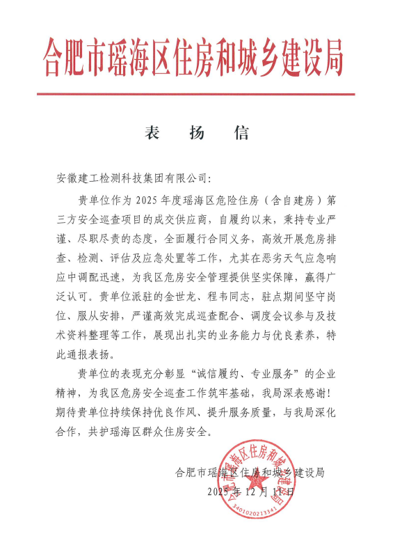 近日,瑤海區(qū)住房和城鄉(xiāng)建設(shè)局向建工檢測公司發(fā)來表揚(yáng)信,對公司在2025年度瑤海區(qū)危險住房(含自建房)第三方安全巡查項目工作中的支持表示感謝,對公司職工的責(zé)任擔(dān)當(dāng)和職業(yè)素養(yǎng)給予充分肯定。