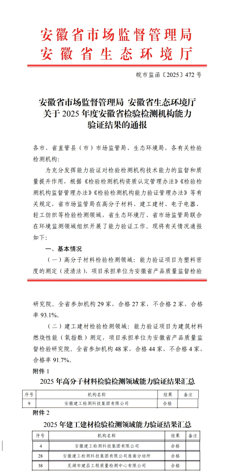 近日,長三角三省一市市場監(jiān)督管理局、安徽省市場監(jiān)督管理局先后通報了2025年度檢驗檢測機(jī)構(gòu)能力驗證結(jié)果。建工檢測公司本部、淮南分場所及所屬環(huán)通檢測、建昌檢測在上述各項能力驗證中結(jié)果均為“合格”。