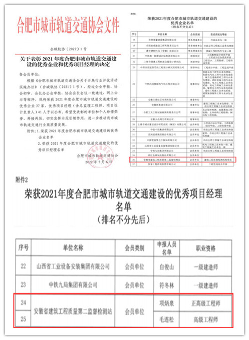 近期從合肥市城市軌道交通協(xié)會傳來喜訊,質(zhì)檢二站獲評2021年度合肥市城市軌道交通建設(shè)“優(yōu)秀企業(yè)”稱號。同時,黨委書記、董事長項炳泉、二站交通軌道檢測所副所長毛連松榮獲2021年度合肥市城市軌道交通建設(shè)“優(yōu)秀項目經(jīng)理”稱號。